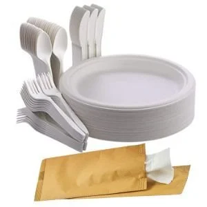Linea completa di stoviglie monouso (piatti, bicchieri, posate…) e tovagliato in carta e TNT